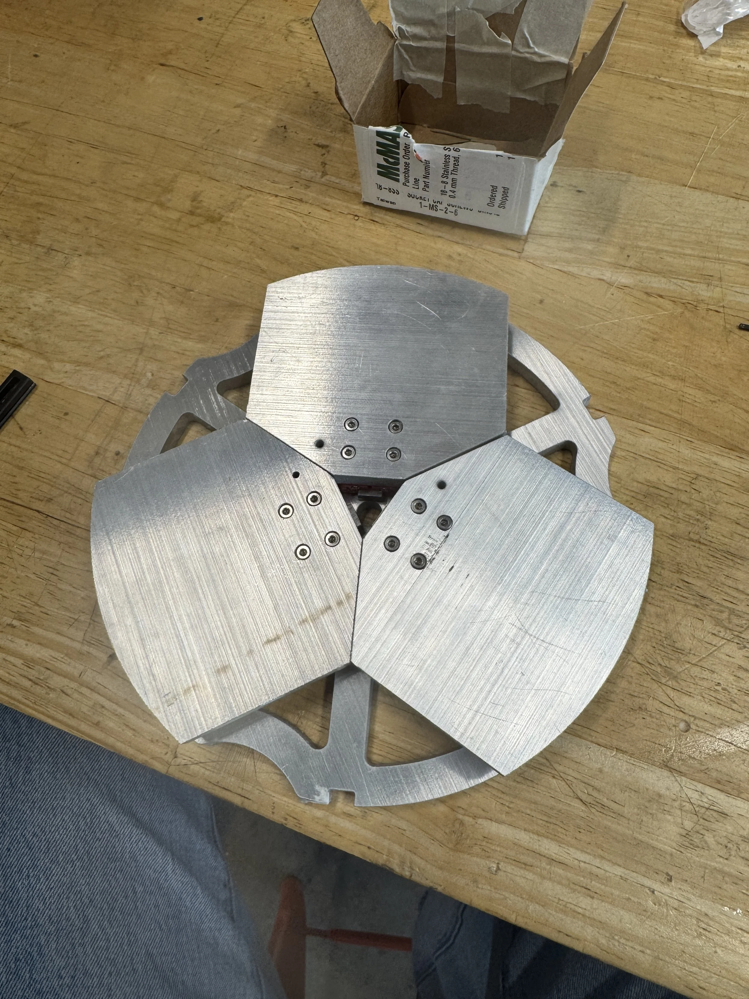 The components of the airbrake which were manufactured were the base plate, cam, servo tray, electronics tray, petals, and struts. All of those components were made from 1/4” aluminum except for the electronics tray, which was 3D-printed from ABS. The aluminum parts were cut using a water jet and then sanded and filed. The water jet required several trials due to the team’s unfamiliarity with its tolerance, but we eventually figured it out. All other components were OTS, some of which being modified (like the coupler tube).